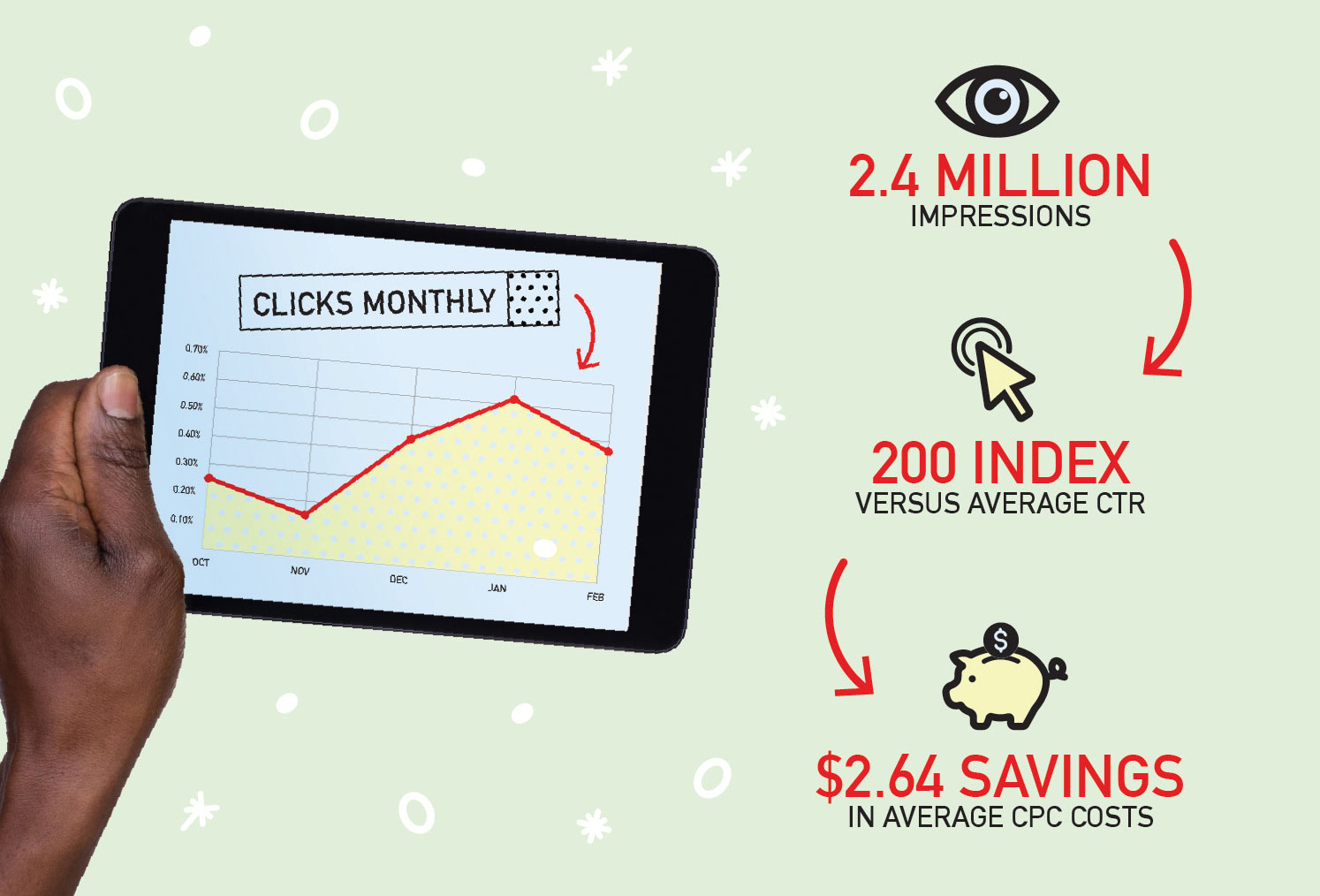 Over 11 months, the digital campaign delivered over 2.4 million impressions with an average click-through rate of .39%, with the restaurant CTR benchmark being 0.19%. For seven months, we saw a click-through rate of at least double the benchmark.