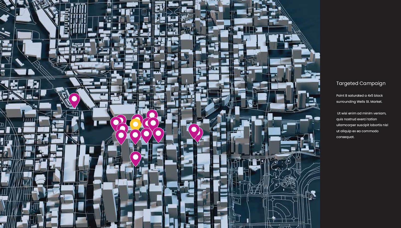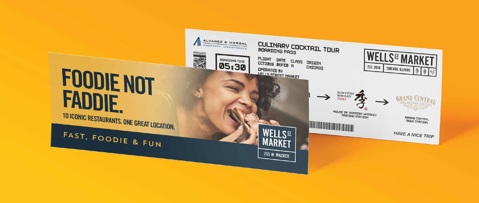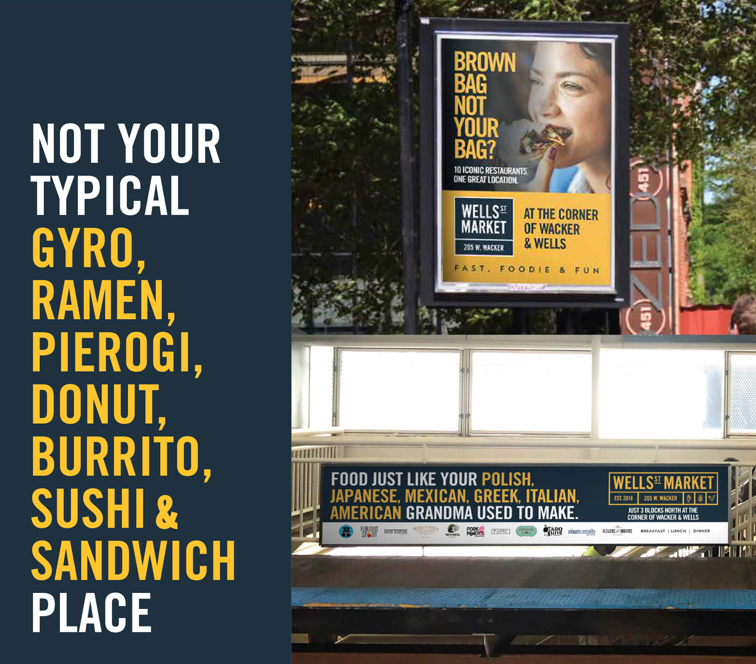 Point B developed an offbeat campaign that communicated “fun and food,” directed at people who work in and around the Chicago Loop. The messaging focused on generating immediate action - saturating the environment [wherever the target audience could be found] and prompting them to visit Wells St. Market while in the area. These targets tended to be youthful, sophisticated white-collar professionals who continuously seek out new culinary experiences. Point B saturated a 4-5 block portion of the NW Loop surrounding the location with signage, digital, mobile, social, and geofencing.